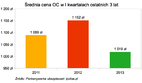 pierwszych kwartałach ostatnich 3 lat można zauważyć, że średnia składka utrzymuje się na równym poziomie i o żadnych drastycznych podwyżkach nie ma mowy. W pierwszym kwartale 2013 roku średnia składka za OC dla wszystkich posiadaczy samochodów osobowych wynosiła 1019 zł. Dla porównania w tym samym okresie 2012 r. 1152
