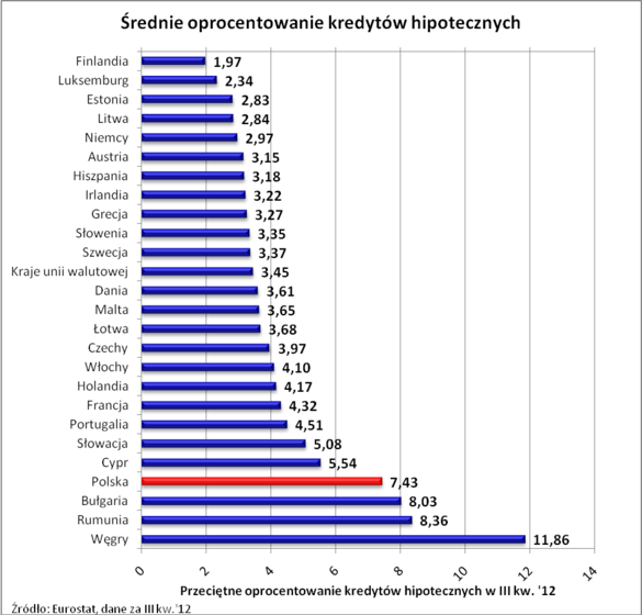Polska znajduje się dopiero na 22.miejscu w Unii Europejskiej pod względem wysokości oprocentowania kredytów hipotecznych – wynika z danych Eurostatu. Po ostatnich obniżkach stóp procentowych, które od sierpnia 2012 roku sprowadziły stawkę WIBOR 3M z poziomu ponad 5,1% do niewiele ponad 4%, wynik mógłby być lepszy, ale niestety najnowsze dane, którymi dysponuje Eurostat pochodzą z 3 kwartału 2012 roku. Wtedy to nowo udzielony nad Wisłą kredyt oprocentowany był na 7,43%. Jest to wynik wyższy niż oprocentowanie widniejące w przeciętnej umowie kredytowej z tamtego czasu, co jest winą zastosowanej przez urząd metodologii.