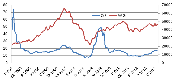 Zmiany wskaźnika C/Z na warszawskiej giełdzie i WIG