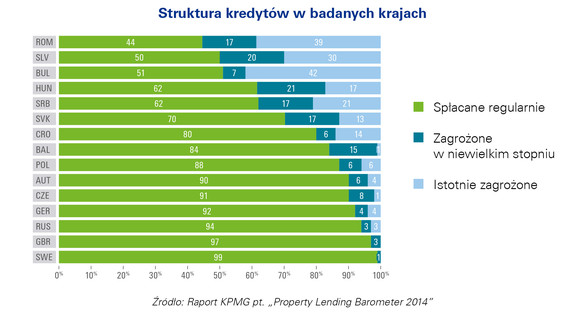 Zgodnie z wynikami raportu KPMG Polska jest jednym z krajów o najwyższym udziale kredytów nieruchomościowych spłacanych w terminie – aż 88% kredytobiorców reguluje swoje należności na czas. W porównaniu z rokiem ubiegłym odsetek kredytów spłacanych regularnie wzrósł o jeden punkt procentowy. Udział kredytów istotnie zagrożonych pozostał bez zmian i wynosi 6%. Lepszy wynik odnotowano jedynie w Czechach, Rosji oraz w badanych krajach Europy Zachodniej i Północnej. Znacznie gorzej wypada wiele krajów Europy Środkowo-Wschodniej. Na Węgrzech odsetek zagrożonych kredytów (istotnie lub w niewielkim stopniu) wynosi blisko 40%, natomiast w Bułgarii, Słowenii i Rumunii – około 50%.