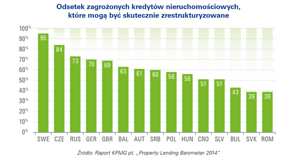 W Polsce rośnie nie tylko odsetek kredytów nieruchomościowych spłacanych w terminie, ale także udział zagrożonych kredytów, które zdaniem banków można z powodzeniem restrukturyzować. Polskie banki szacują, że jest to możliwe w przypadku 58% zagrożonych kredytów, podczas gdy w ubiegłym roku udział ten wyniósł 45%. Wśród państw Europy Środkowo-Wschodniej jedynie w Czechach, Polsce i krajach bałtyckich odnotowano lepszy wynik niż w poprzedniej edycji badania. W pozostałych krajach regionu widoczny jest spadek optymizmu co do możliwości restrukturyzacji zagrożonych kredytów. Spośród wszystkich badanych krajów najbardziej optymistyczne w tej kwestii są banki w Szwecji i Czechach, gdzie skutecznie można poddać restrukturyzacji odpowiednio 95% i 84% niespłacanych kredytów.