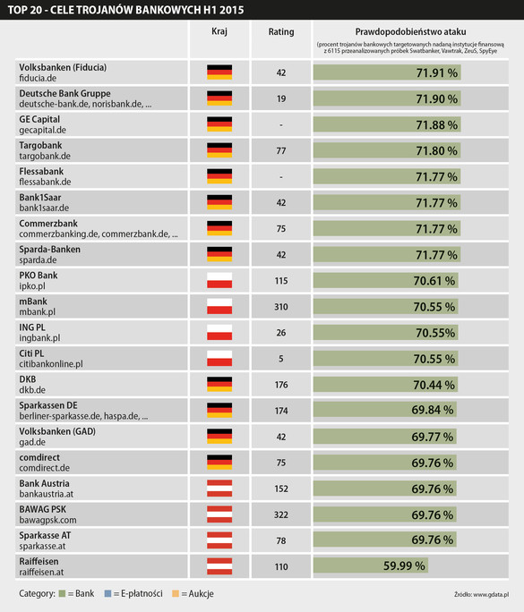 Specjaliści z G DATA SecurityLabs opublikowali raport zagrożeń występujących w pierwszym półroczu 2015 roku. Publikacja zawiera m.in informacje na temat trojanów bankowych i ich głównych celów. Dane znajdujące się w raporcie mogą zaniepokoić rodzimych klientów PKO BP, mBanku, ING oraz Citibank.