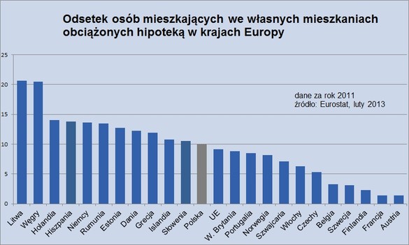 Dziś we własnym domu lub mieszkaniu obciążonym hipoteką mieszka co dziesiąty Polak. To wynik zbliżony do średniej europejskiej. Co warto odnotować, w kredytowanych nieruchomościach częściej mieszkają obywatele krajów, gdzie współczynnik przeludnienia jest niski: Holendrzy, Niemcy, Hiszpanie czy Duńczycy. W dużo trudniejszej sytuacji są Węgrzy. Ponad 20 procent z nich żyje w domu lub mieszkaniu obciążonym hipoteką, jednocześnie połowa z tych lokali jest przeludniona.