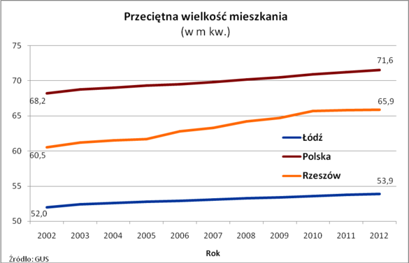 Na drugim biegunie znaleźć można natomiast Łódź. Jest to miasto wojewódzkie o najmniejszych mieszkaniach. Tu przeciętna powierzchnia w 2012 roku była na poziomie 53,9 m kw. Kolejny w rankingu Kraków uzyskał już wynik na poziomie 57 m kw. Niewiele większe mieszkania można znaleźć w Bydgoszczy (57,4 m kw.) i Toruniu (57,9 m kw.), a tuż za nimi plasuje się Warszawa ze skromnym wynikiem 58,5 m kw.