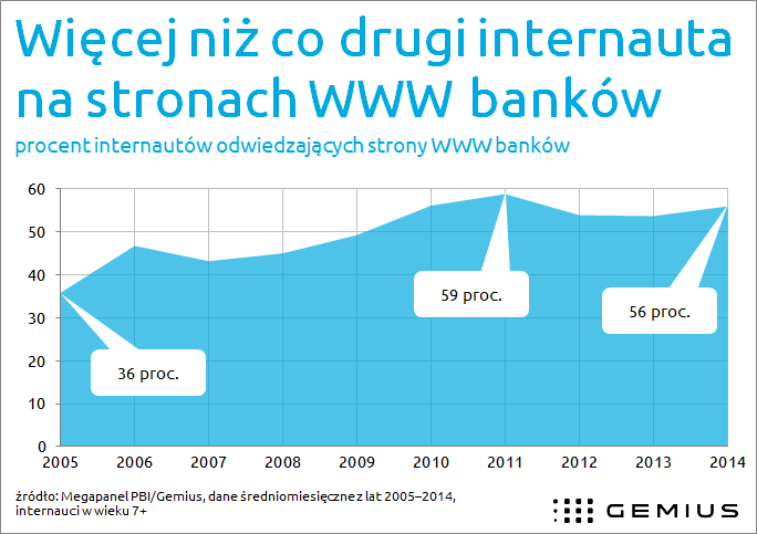 Analiza pokazuje, że w ciągu 10 lat o ponad połowę wzrósł odsetek internautów odwiedzających strony WWW banków. Według danych z kwietnia 2015 roku już sześciu na dziesięciu użytkowników sieci odwiedziło przynajmniej jedną z nich. Tymczasem w 2005 roku na stronach WWW instytucji finansowych gościło miesięcznie średnio 36 proc. internautów.