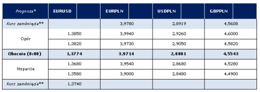 Jeśli popołudniowa seria danych ze Stanów Zjednoczonych będzie równie pozytywna to może być świadkami kontynuacji wzrostów na rynkach kapitałowych oraz na rynku towarowym. Oba te ruchy sprzyjać mogą wzrostowi kursu pary EUR/USD w kierunku istotnego poziomu oporu w okolicach ceny 1,3850 USD za jedno euro. Styczniowe raporty z amerykańskiego rynku nieruchomości oraz sektora przemysłowego na pewno będą miały swój wpływ na rynek walutowy. Obie figury mają szanse potwierdzić dalszą poprawę sytuacji gospodarczej w USA, gdyż rynek nieruchomości nadal wspierany jest rządowymi dopłatami do kredytów hipotecznych a wraz z ożywieniem w handlu międzynarodowym możemy mówić o coraz dynamiczniejszym uzupełnianiu zapasów przez producentów przemysłowych. Największą uwagę inwestorzy skupią jednak ostatecznie na wieczornych projekcjach makroekonomicznych amerykańskiego FED-u.