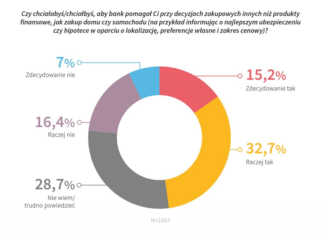 Podstawową rolą banku jest świadczenie usług finansowych i to z tym obszarem najczęściej kojarzy się pojęcie bankowości. Jednakże współcześnie konsumenci szukają wsparcia nie tylko przy podejmowaniu decyzji zakupowych dotyczących produktów finansowych, ale także w przypadku zakupu domu czy samochodu. Informacje o najlepszym ubezpieczeniu czy hipotece w oparciu o lokalizację, preferencje własne klienta lub zakres cenowy mogą okazać się niezwykle pomocne w ostatecznym rozstrzygnięciu odnośnie zakupu.