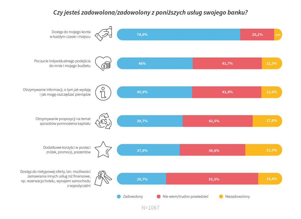 Najwięcej, bo aż 3/4 Polaków, jest zadowolonych z dostępu do swojego konta w każdym miejscu i czasie. Na drugim miejscu cenią sobie zarówno poczucie indywidualnego podejścia do siebie jako klienta oraz do swojego budżetu (46%), jak i otrzymywanie informacji o tym, jak wydają i jak mogą oszczędzać pieniądze (45,9%). Propozycje na temat sposobów pomnożenia kapitału oraz dodatkowe korzyści w postaci zniżek, promocji czy prezentów to zaleta dla prawie 40% osób. Natomiast niecałe 30% jest usatysfakcjonowanych z dostępu do nietypowej oferty, czyli możliwości korzystania z innych usług niż finansowe, np. w sytuacji rezerwacji hotelu czy wynajmu z wypożyczalni samochodu.