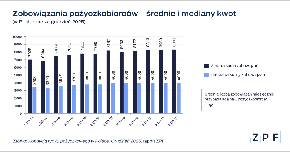 Na poniższej grafice prezentujemy zobowiązania pożyczkobiorców – miesięczne średnie i mediany kwot.