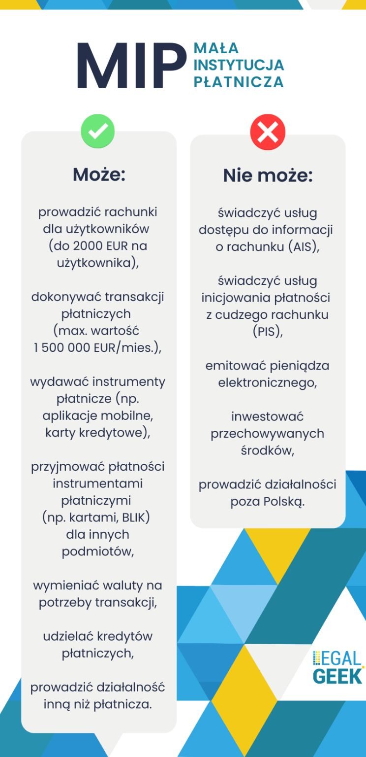 Zakres usług, które świadczyć mogą małe instytucje płatnicze jest szeroki, ale ma pewne ograniczenia względem KIP-ów. Przede wszystkim MIP-y mogą działać jedynie na terytorium Polski – wyłączone są z obsługi transakcji międzynarodowych. Na rachunkach płatniczych jednego klienta przechowywać mogą maksymalnie 2 tys. euro, a średnia miesięczna wartość wszystkich wykonanych transakcji płatniczych z 12 miesięcy nie może przekroczyć 1,5 mln euro.