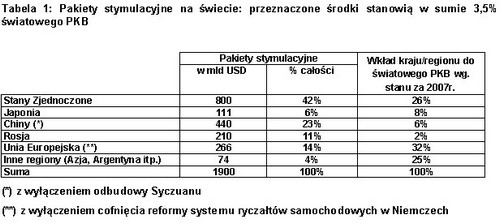 Odpowiedź w postaci pakietów stymulacyjnych jest wyjątkowa, zarówno pod względem budżetowym (całość środków stanowi 3,5% globalnego PKB, por. Tabela 1), jak i monetarnym. Ponadto każdy pakiet jest inny, gdyż dostosowany jest do specyficznych cech poszczególnych państw (por. Tabela 2).