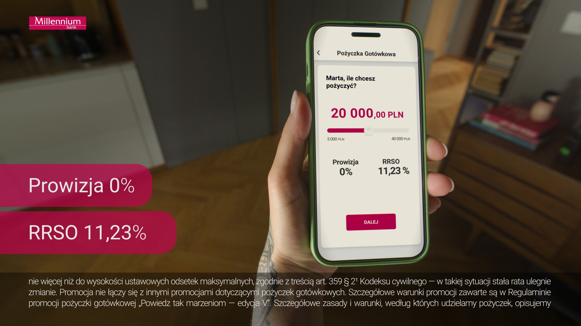 W Banku Millennium pożyczkę na małe i duże wydatki można wziąć online i bez prowizji. W aktualnej promocji „Powiedz tak marzeniom-edycja V”, Rzeczywista Roczna Stopa Oprocentowania wynosi 11,23%. Klient sam decyduje, jak długo będzie spłacał zobowiązanie w stałych ratach. Pożyczkę można uzyskać do 25 lipca 2025 na okres od 48 do 70 miesięcy, z kwotą do wypłaty od 5000 do 40 000 zł. Z promocji skorzystać mogą klienci, którzy nie posiadają aktywnej pożyczki gotówkowej lub konsolidacyjnej w momencie wnioskowania oraz nie posiadali ich w okresie ostatnich 6 miesięcy.1