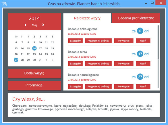 Aplikacja została stworzona wyłącznie jako narzędzie ułatwiające planowanie i pamiętanie o badaniach medycznych użytkownika.