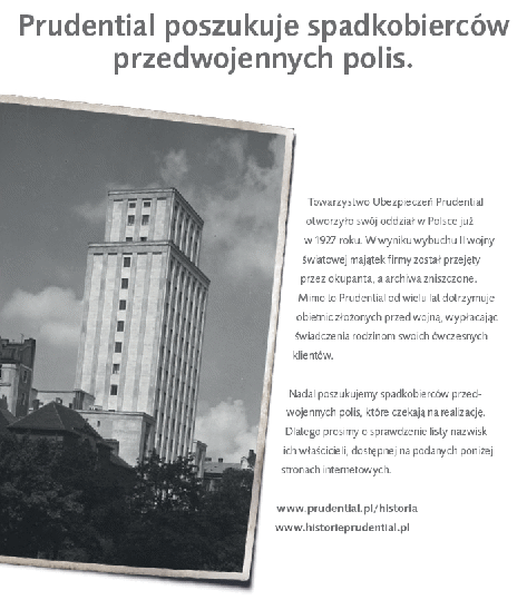 Brytyjski ubezpieczyciel rozpoczął publikację ogłoszeń prasowych skierowanych do potencjalnych spadkobierców. Jest to drugi etap kampanii informacyjno-reklamowej, odwołującej się do przedwojennych polis wystawionych w Polsce przez Prudential. Działający w Polsce od 1927r. Prudential wystawił do wybuchu drugiej wojny światowej 4 623 polisy na życie. Do chwili obecnej świadczenia z przedwojennych polis otrzymało 2 706 spadkobierców ich posiadaczy. Ubezpieczyciel poszukuje informacji mogących pomóc