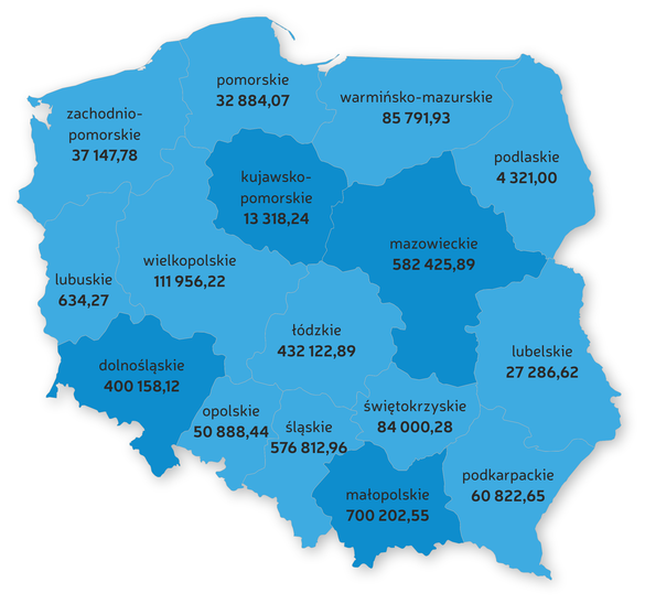 Rys.2. Łączna wartość zadłużenia biur podróży w podziale na województwa – stan na 01.06.2016 r.