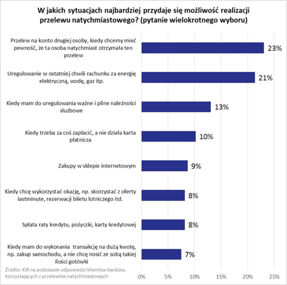 Wzrasta liczba osób, dla których ważna jest pewność, że pieniądze dotrą na konto odbiorcy bezzwłocznie – deklaruje to 23 proc. klientów banków, którzy uznają przelewy natychmiastowe za przydatne (wobec 19 proc. odnotowanych w ubiegłym roku). Co piąte wskazanie (21 proc.) dotyczy sytuacji, w których musimy w ostatniej chwili opłacić rachunek za energię elektryczną, wodę, czy gaz. Za trzecią najważniejszą korzyść ankietowani uznali możliwość uregulowania za pomocą przelewu natychmiastowego ważnych i pilnych należności służbowych (13 proc.).