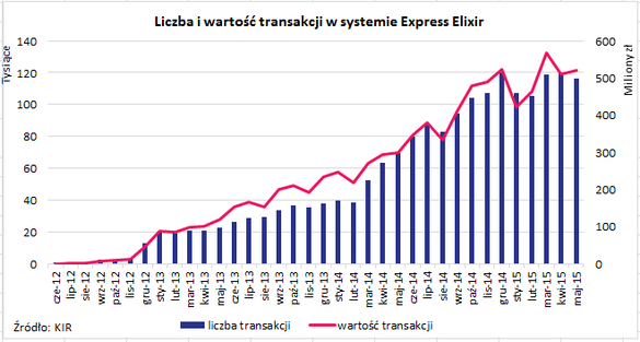 Rosnąca popularność przelewów natychmiastowych widoczna jest w statystykach systemu Express Elixir. W pierwszym roku kalendarzowym funkcjonowania usługi rozliczonych zostało 22,2 tys. transakcji o wartości ponad 78 mln zł. W ubiegłym roku klienci banków zlecili 940 tys. przelewów natychmiastowych na kwotę 4,2 mld zł. W maju 2015 r. przetworzonych zostało ponad 116 tys. transakcji o wartości przekraczającej 521 mln zł. W stosunku do maja ub.r. liczba i wartość transakcji wzrosła odpowiednio o 46,6 tys. i 222 mln zł.