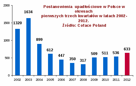 Wyraźną zależność potwierdza wykres przedstawiający liczbę upadłości przedsiębiorstw w Polsce w okresie ostatnich 5 lat oraz liczbę przeterminowanych należności zgłoszonych do ubezpieczyciela Coface Poland. Dane zostały zagregowane do okresów kwartalnych, a jako bazę równą 100% przyjęto wyniki w I kwartale przedkryzysowego roku 2008.