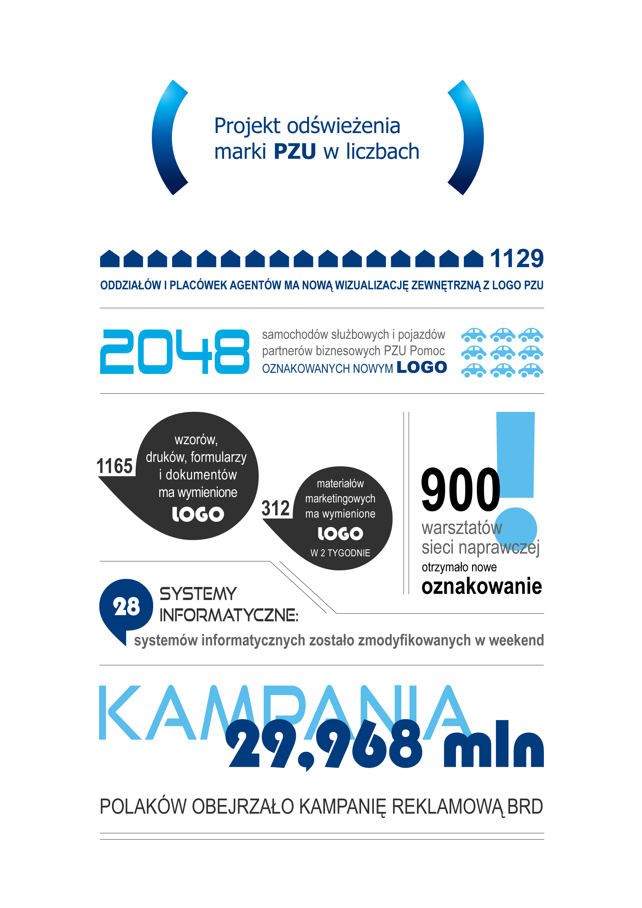 W ciągu 2 miesięcy nową wizualizację zewnętrzną z logo PZU otrzymało w sumie 1129 oddziałów i placówek agentów, 900 warsztatów sieci naprawczej oraz ponad 2000 samochodów służbowych i pojazdów partnerów biznesowych PZU Pomoc. Nowa identyfikacja to także duża praca wewnątrz firmy. Zmianie uległo 1 165 wzorów druków, formularzy i dokumentów. Była to ogromne wyzwanie logistyczne, w które zaangażowanych było kilkaset osób.