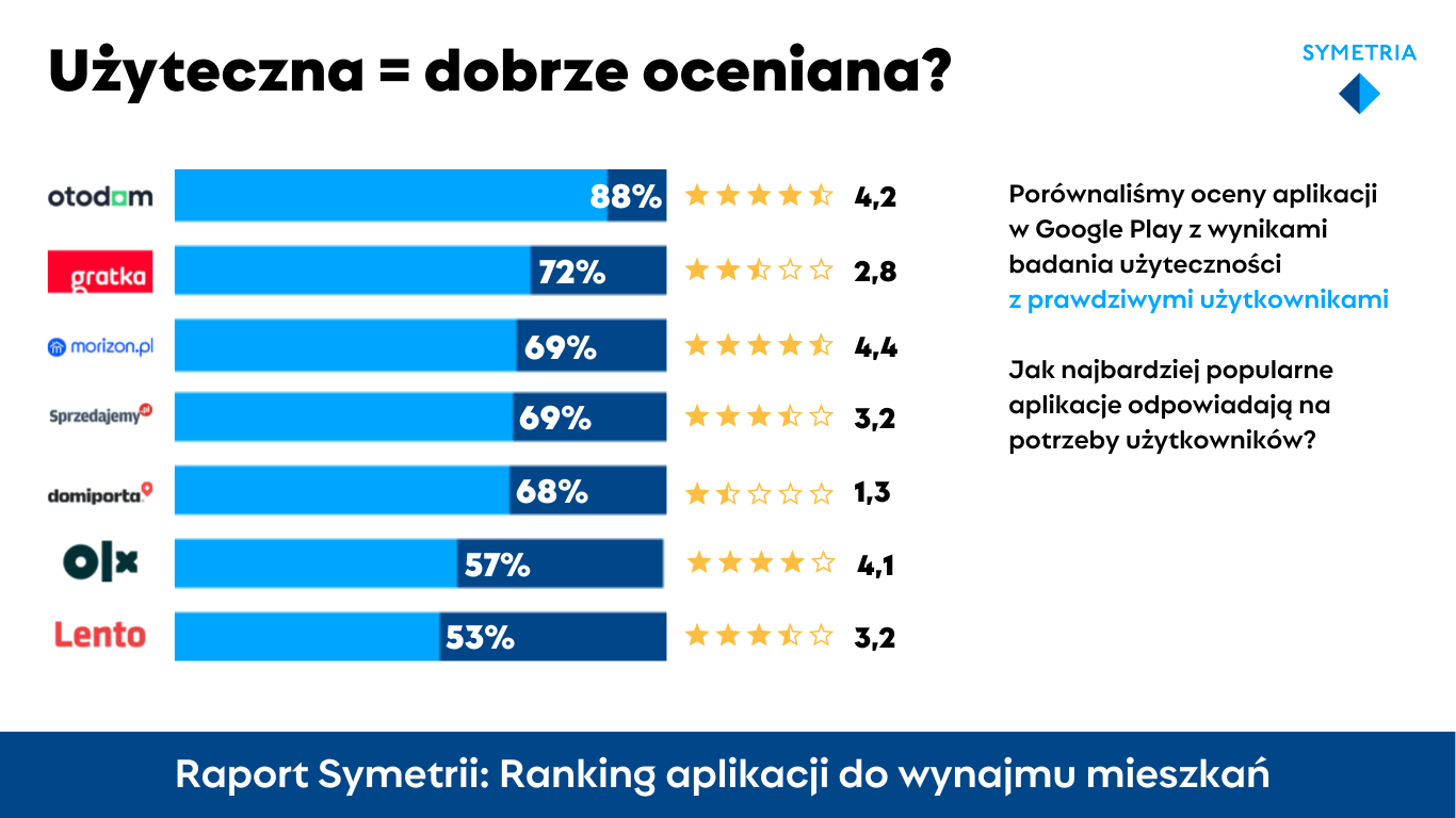 Symetria UX-PM w rankingu stworzonym przy użyciu UX INDEX PIRAMID uwzględniła siedem najpopularniejszych aplikacji ułatwiających wynajęcie mieszkań: OLX, Otodom, Gratka, Morizon, Domiporta, Sprzedajemy i Lento.