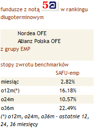 W dalszej części rankingu, na uwagę zasługuje awans Aegon OFE z 9 na 6 miejsce. Jego długoterminowa ocena wzrosła do 3a, a krótkoterminowa do 4a. Awans to przede wszystkim zasługa bardzo dobrych wyników w ostatnich miesiącach. W czwartym kwartale 2012 r. Aegon OFE wypracował drugą stopę zwrotu wśród funduszy emerytalnych, +6,6% i osiągnął wynik o +0,6 pkt proc. lepszy od benchmarku. W drugim półroczu fundusz wypracował trzecią stopę zwrotu wśród OFE (+10,7%).