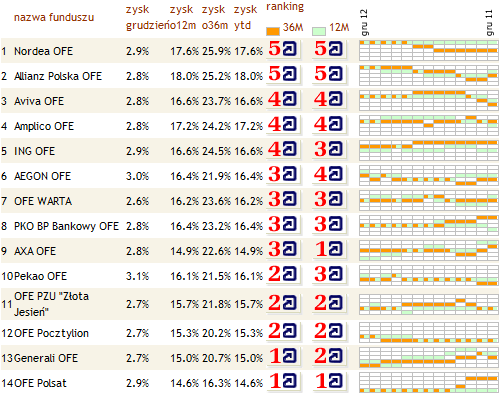 W całym 2012 r., trzy OFE mogą pochwalić się zyskiem wyższym niż +17%: Allianz Polska OFE (+18,0%), Nordea OFE (+17,6%) i Amplico OFE (+17,3%). Najsłabiej zachowywały się jednostki OFE Polsat, AXA OFE i Generali OFE, które zyskały odpowiednio +14,6%, +14,9% oraz +15,0%. Różnica między najlepszym a najsłabszym funduszem wyniosła 3,4 pkt. proc. w skali roku.