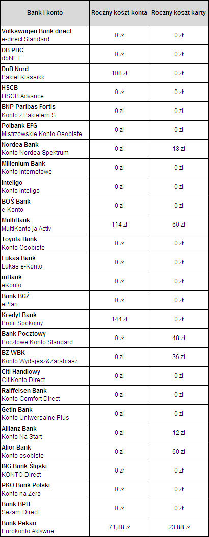 Na przykład DnB Nord oferuje tani kredyt w koncie, ale za samo prowadzenie rachunku klient zapłaci rocznie 108 zł. Z kolei Volkswagen Bank direct czy DB PBC oferują bezpłatne konta. Jeśli otwieramy kredyt w banku, w którym i tak mamy rachunek, to opłata nie powinna być rozpatrywana w kategoriach dodatkowego kosztu.