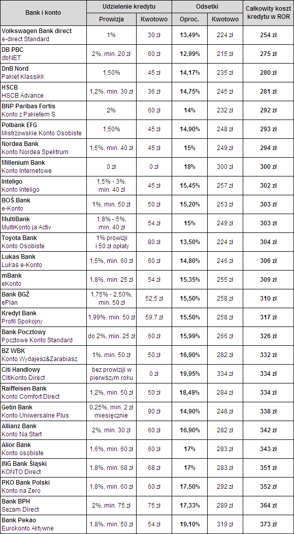 Z zestawienia wynika, że najtańszy kredyt w koncie oferuje swoim klientom internetowy Volkswagen Bank direct. Za 3 tys. zł spłacane przez rok zapłacimy 224 zł plus 30 zł prowizji. Drugie miejsce zajmuje Deutsche Bank PBC z kontem dbNET (łączny koszt to 275 zł), a trzecie bank DnB Nord (280 zł). Aż w siedmiu bankach całkowity koszt kredytu wyniesie mniej niż 300 zł.