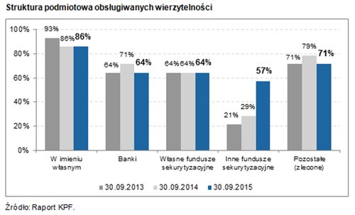 Równie istotny jest fakt, iż w strukturze obsługiwanych wierzytelności obserwujemy systematyczny wzrost znaczenia usług świadczonych na rzecz innych niż własne funduszy sekurytyzacyjnych. W stosunku do III kw. 2014 r. ich względna liczba zwiększyła się z 29% aż do 57%. Po raz pierwszy także aż 7,1% badanych firm zadeklarowało współpracę z 8 funduszami sekurytyzacyjnymi. Jednocześnie, coraz więcej firm nie posiada własnych funduszy sekurytyzacyjnych. W III kw. 2015 r. takich firm było już prawie 43%.
