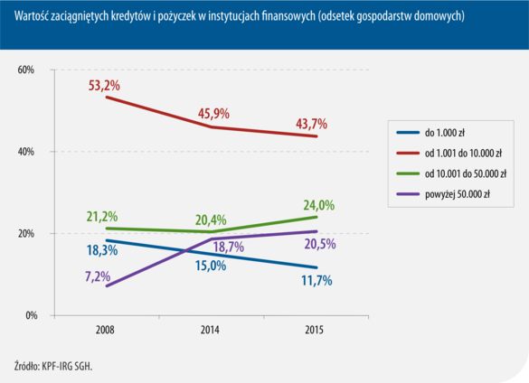 Znamienne, że w grupie gospodarstw domowych, posiadających zobowiązania finansowe, zawężonej do zobowiązań kredytowych i pożyczkowych, sukcesywnie maleje udział zaciągających kredyty i pożyczki o wartości do 1 000 PLN. W 2008 stanowiły one 18,3%, podczas gdy w 2014 nastąpił spadek do 15%, a rok później – już tylko 11,7%. W poddawanych analizie okresach, niezmiennie największy odsetek odnotowuje się dla produktów o wartości od 1 000 do 10 000 PLN. Średnia dla 2015 roku była bliska 44%. Jednak i w tej kategorii kredytów i pożyczek można zaobserwować tendencję malejącą – jeszcze siedem lat temu stanowiły one 53,2% ogółu, natomiast w 2014 – już niespełna 46%. Z kolei odwrotny trend ma miejsce w odniesieniu do kredytów i pożyczek o wyższej wartości. Prawie o 4 pp. w stosunku do zeszłego roku wzrósł udział produktów o wartości 0d 10 000 PLN do 50 000 PLN, a o blisko 2 pp., do 20,5% – odsetek kredytów o wartości powyżej 50 000 PLN.