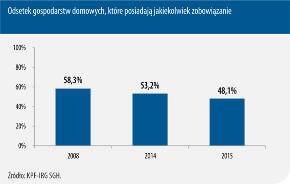 Posiadanie jakiegokolwiek zobowiązania finansowego w 2015 zadeklarowało średnio mniej niż połowa badanych przez KPF i IRG SGH respondentów. Odsetek ten wyniósł 48,1% gospodarstw domowych, podczas gdy – dla porównania – przed siedmioma laty i przed rokiem udział był wyższy – odpowiednio 58,3% i 53,2%.