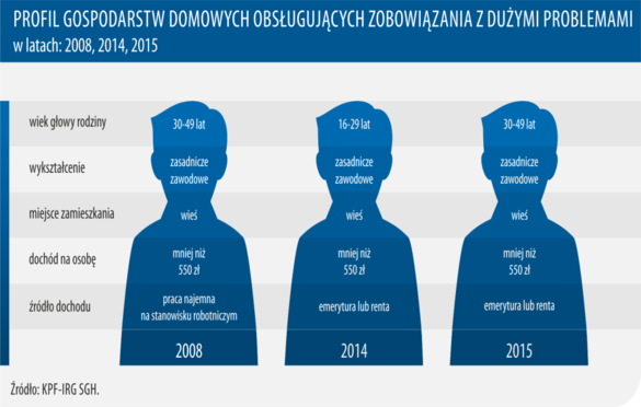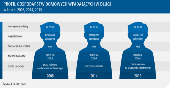 Największy odsetek gospodarstw domowych, mających problemy z długami, zidentyfikowano w grupie tych, których głowa znajduje się w przedziale wiekowym 30-49 lat i jest to cecha stała dla całego analizowanego okresu. Wspólny mianownik stanowi również fakt zamieszkiwania na wsi oraz dochód na osobę, wynoszący mniej niż 550 PLN. Tym co różni profil statystycznego dłużnika w 2015 roku od tego z lat 2014 i 2008 jest wykształcenie – w br. przeważają gospodarstwa, których głowa legitymuje się wykształceniem średnim lub policealnym w odróżnieniu od poprzednich lat, kiedy dominowała kategoria „zasadnicze zawodowe”.