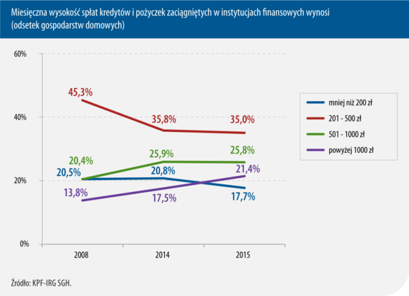 Tak, jak znacząco obniżył się odsetek zobowiązań o wartości do 1.000 PLN zaciąganych w instytucjach finansowych, tak podobnie zmniejsza się udział gospodarstw, deklarujących, że na spłaty przeznaczają nie więcej niż 200 PLN miesięcznie. W 2014 roku stanowiły one 20,8%, a rok później już 17,7%. Jedno na trzy gospodarstwa domowe, posiadające kredyty lub pożyczki co miesiąc spłaca między 200 PLN a 500 PLN, a nieco więcej niż co czwarte – kwoty, mieszczące się w przedziale 501 – 1.000 PLN. Poziom spłat w obu tych kategoriach kwotowych w 2015 roku nieznacznie odbiega od tego z 2014 roku. Zdecydowanie natomiast zwiększył się odsetek gospodarstw, które miesięcznie spłacają więcej niż 1.000 PLN – o ile przed rokiem było ich 17,5%, o tyle w br. już 21,4%.