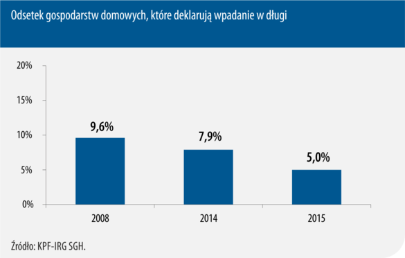 Systematycznie, od siedmiu lat, maleje odsetek gospodarstw domowych, określających swoją sytuację finansową jako „wpadanie w długi”. O ile w 2008 roku, tuż przed wybuchem kryzysu, ich średnioroczny udział zbliżał się do 10% ogółu badanych gospodarstw, o tyle w 2015 już tylko jedno na dwadzieścia (5%) tak definiowało swoją kondycję ekonomiczną. Warto zauważyć, że obniżenie zjawiska popadających w zadłużenie w skali roku o 3 punkty procentowe oznacza dość znaczącą korzystną zmianę.