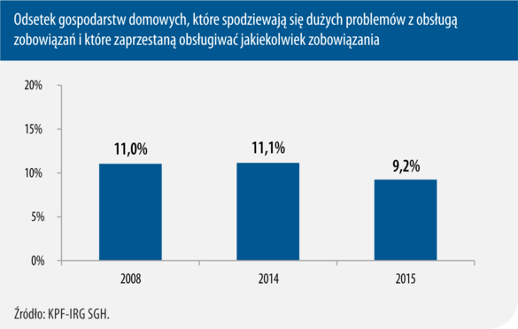Popadanie w długi, w przypadku gospodarstw domowych, może sygnalizować prawdopodobieństwo znalezienia się w sytuacji nadmiernego zadłużenia rozumianej jako utratę płynności finansowej do tego stopnia, że ustaje ich zdolność do regulowania należności. Stopień intensyfikacji tego negatywnego dla gospodarki zjawiska dobrze oddają dane, odnoszące się do zarówno jakości bieżącej obsługi zobowiązań, jak i oczekiwań gospodarstw domowych w tym zakresie. Średnioroczny odsetek gospodarstw deklarujących, że obsługa ich zobowiązań w minionych 12 miesiącach odbywała się z dużymi problemami – zaległościami poniżej 6 miesięcy i zaległościami powyżej tego okresu – w 2015 zmniejszył się nieznacznie w stosunku do ubiegłego roku, osiągając poziom 11%, a tym bardziej względem stanu sprzed siedmiu lat, kiedy to udział gospodarstw, borykających się z takimi problemami wynosił 13,4%.