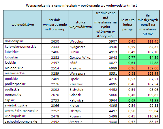 W dniu 29 listopada br. prezes Głównego Urzędu statystycznego opublikował dane nt. wysokości przeciętnego miesięcznego wynagrodzenia w województwach. Z porównania tych danych oraz publikowanych przez portal nieruchomości domy.pl średnich cen ofertowych mieszkań w stolicach województw wynika, że najkorzystniej w tym zestawieniu wypadają osoby pracujące w woj. łódzkim, śląskim i lubuskim. Za miesięczną pensję mogą kupić odpowiednio 0,64 m2, 069 m2 i 0,77 m2 mieszkania. Uzyskujący średnie wynagrodzenie w tych województwach potrzebują na zakup 50-metrowego mieszkania: w Łodzi – 78 miesięcznych pensji, w Katowicach – 72 miesięczne pensje, a w Gorzowie Wlkp. – niespełna 65 miesięcznych pensji.