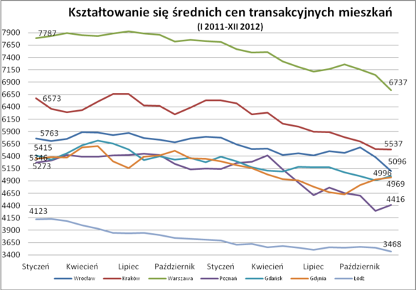 Końcówka roku nie okazała się okresem wyróżniającym się pod względem liczby dokonywanych transakcji. Beneficjentami wygasłego już programu Rodzina na swoim stali się deweloperzy, a niskie limity dla rynku wtórnego nie pozwoliły (poza Łodzią i Poznaniem) na dofinansowanie przy zakupie mieszkania z drugiej ręki. Na siedem analizowanych miast niższe ceny mieszkań widoczne są w czterech lokalizacjach. Największe spadki widoczne są we Wrocławiu, gdzie w porównaniu do notowania cen z grudnia 2012 r. odnotowujemy 5,3 proc. spadek średniej ceny transakcyjnej. Warte odnotowania są też niższe ceny mieszkań w Warszawie (o 4,4 proc.), gdzie średnia cena jest już znacznie niższa od bariery 7000 zł i wynosi 6737 zł za m kw. Po względnej stabilizacji cen w Łodzi nabywcy ponownie obniżyli poprzeczkę cenową. Spadek o 2,1 proc. w porównaniu do ceny z grudnia daje średnią cenę transakcyjną za poziomie 3468 zł za m kw. Tylko 12 zł na m kw. spadły ceny mieszkań w Krakowie. Spadki nie dotknęły Trójmiasta, gdzie w Gdańsku i Gdyni wskaźnik cen mieszkań drgnął w górę i przyniósł wzrosty o odpowiednio 1,7 i 0,9 proc. w odniesieniu do notowań z grudnia. Po dłuższych spadkach odbicie cen pojawiło się w Poznaniu, gdzie obecnie średnia cena m kw. kształtuje się na poziomie 4416 zł.