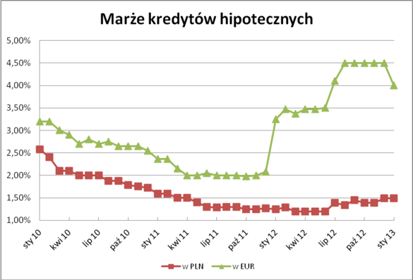W minionym roku nastąpiła zmiana sytuacji na rynku kredytów hipotecznych w złotych. Od 2009 r. marże tego rodzaju kredytów były systematycznie obniżane. Przeciętna marża z poziomu 2,85% spadła do 1,2%. Jednak w czerwcu 2012 r. nastąpiło odwrócenie tej tendencji. Marże zaczęły rosnąć i obecnie przeciętna marża wynosi już 1,49%, podczas gdy przed rokiem wynosiła 1,25%.