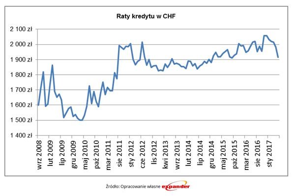W przypadku kredytu we frankach na kwotę 300 000 zł na 30 lat, zaciągniętego w sierpniu 2008 r., najbliższa rata może wynieść ok. 1915 zł. To o 142 zł mniej niż w grudniu ubiegłego roku, kiedy kurs wynosił ok. 4,13 zł. Tak niskie raty po raz ostatni widzieliśmy w sierpniu i wrześniu 2015 r. Sytuacja nie wygląda jednak tak różowo, jeśli spojrzymy na cały okres spłaty. Przez większość okresu 2012 – 2014 r. rata wahała się między 1800 zł i 1900 zł, a 7 lat temu wynosiła tylko 1500 zł.