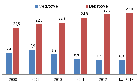 Gwałtownie przyrasta natomiast liczba kart debetowych. Polacy mają ich już w portfelach 27 037 tys. Tylko w pierwszych trzech miesiącach roku przybyło prawie 450 tys. nowych plastików debetowych. W całym 2012 r. skok wyniósł 1,76 mln, a rok wcześniej jeszcze więcej, bo 2,2 mln. Nie ma wątpliwości, że nie są to wyłącznie karty do kont osób, które decydują się na swój pierwszy ROR. Polacy zachęceni promocjami i prezentami dla nowych klientów otwierają coraz więcej kont uzbrojonych w kartę debetową.
