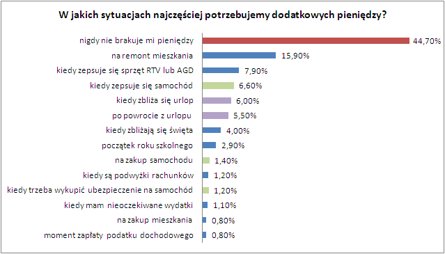 Po pożyczkę część ankietowanych jest skłonna sięgnąć, gdy zepsuje się sprzęt AGD lub RTV albo gdy zbliżają się święta czy początek roku szkolnego. Zdarza się, że dodatkowe środki potrzebne są na uregulowanie zobowiązań podatkowych.