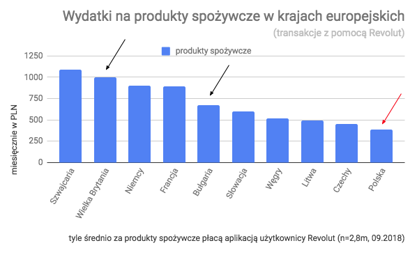 Ważną pozycją kosztową w codziennym budżecie są zakupy spożywcze. Najmniej na te produkty przy pomocy Revolut wydają Polacy (na 37 krajów). Co to oznacza? Albo ceny żywności nad Wisłą są niższe albo do zakupów spożywczych Polacy rzadziej korzystają z aplikacji. Są to wydatki rzędu 388 PLN miesięcznie. Być może jedzenie częściej kupujemy za gotówkę? Relatywnie wysoki poziom wydatków spożywczych dziwi w Bułgarii (25 miejsce, 674 PLN), ale nie zaskakuje u znanych z zamiłowania do dobrej kuchni Włochów (4 miejsce, 980 PLN). Najwięcej na jedzenie wydają z pomocą Revolut zamożni Szwajcarzy (1091 PLN) i Brytyjczycy (999 PLN).