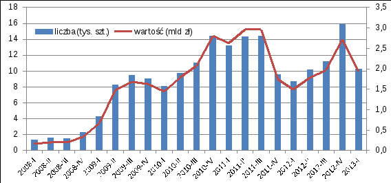 W ostatnich czterech kwartałach wypłacono 47,3 tys. kredytów RnS na łączną kwotę 8,37 mld zł. W stosunku do 12-miesięcznego okresu zakończonego trzy miesiące temu jest to więcej o 3,4 proc. liczbowo i o 5,5 proc. wartościowo. Dzięki dobrym wynikom ze stycznia, zakończony w marcu 12-miesięczny okres był pod względem liczby kredytów najlepszy od tego zakończonego w grudniu 2011 r.