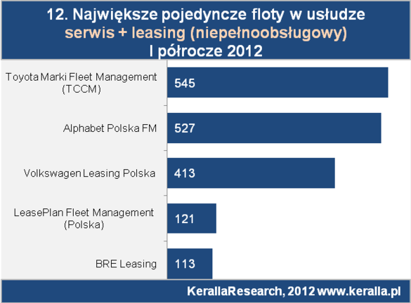 Największą krajową flotą w wynajmie niepełnoobsługowym, 545 pojazdy, opiekuje się Toyota Marki, następnie Alphabet Polska (527) oraz Volkswagen Leasing Polska (413).