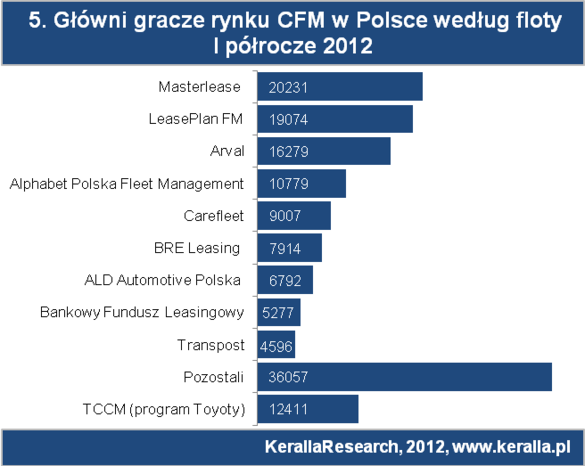 Do ważniejszych wydarzeń w badanym okresie należy fuzja spółki KBC Autolease i Business Lease Poland. Pod skrzydła Business Lease Poland przeszli klienci spółki KBC i w efekcie Business Lease wg danych PZWLP zarządza flotą ok. 6 tys. pojazdów, co plasuje ją w pierwszej dziesiątce graczy, jednak ze względu na brak twardych statystyk, dane spółki umieszczono w kategorii pozostali. W badanym okresie wycofały się z rywalizacji rynkowej dwie inne spółki CFM (Samset oraz Sorgan), tak więc stopniowo krajowy rynek CFM przechodzi proces konsolidacji i zmian, które w perspektywie upodobnią go, jak można sądzić, do modelu zachodnioeuropejskiego.