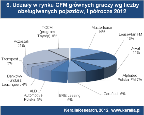Po wcześniej notowanych spadkach, spółki CFM odbudowują sukcesywnie portfel klientów skłonnych oddać pojazdy firmowe tylko w zarządzanie (tj. usługa pozbawiona finansowania zewnętrznego) choć tu wyraźne są nieustanne zmiany, co świadczy, że to wariant usług najbardziej podatny na odpływ klientów i wymagający największej aktywności sprzedażowej. Po I półroczu br. 12 984 pojazdy były wyłącznie zarządzane przez firmy CFM, co daje wzrost 5,6% dla tej formy użytkowania aut firmowych licząc wobec roku ubiegłego analogicznego okresu, lecz stanowi spadek, jeśli wziąć pod uwagę, że jeszcze w grudniu 2011 pojazdów w wyłącznym zarządzaniu raportowano na poziomie 13,1 tys. aut.