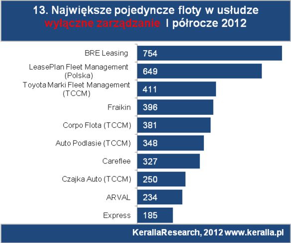 Największe pojedyncze floty wyłącznie zarządzane ma w portfelu BRE Leasing (754 pojazdy), Lease Plan (649), Toyota Marki (411) oraz Fraikin (396 pojazdów).