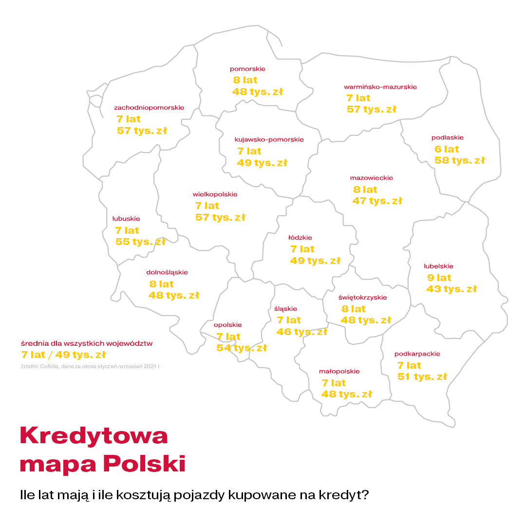 Najniższą wartość kredytowanych samochodów Cofidis notuje w województwie lubelskim – 43,2 tys. zł, czyli tam gdzie średni wiek kredytowanego pojazdu jest najwyższy. Na drugim biegunie jest województwo podlaskie, którego mieszkańcy decydują się na skredytowanie stosunkowo najnowszych pojazdów, o średniej wartości niemal 58 tys. zł. W województwach: zachodniopomorskim, warmińsko-mazurskim i wielkopolskim jest to niewiele mniej, bo około 57 tys. zł. W tych regionach średnia wieku pojazdów wynosi około siedmiu lat.