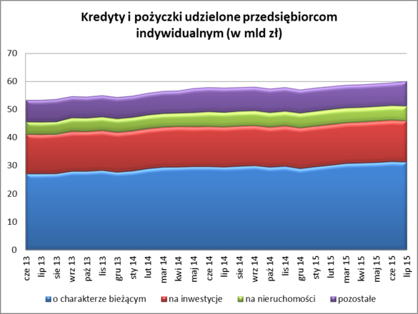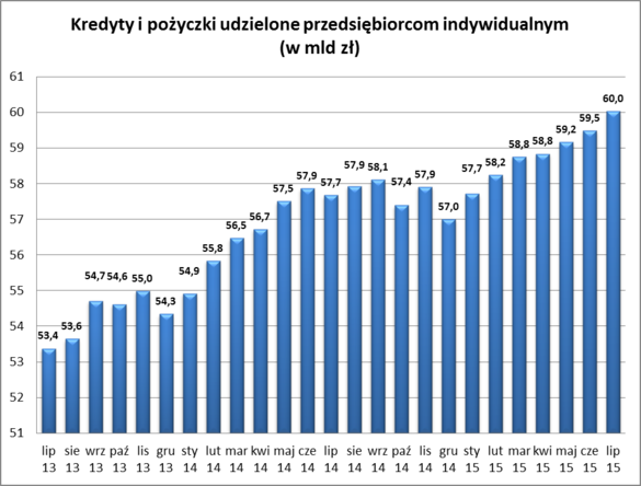 Na koniec lipca wartość kredytów udzielonych przedsiębiorcom indywidualnym przekroczyła 60 mld zł. Tym razem rosły przede wszystkim kredyty z kategorii „pozostałe”, do których zaliczane są m.in. pożyczki udzielane na zakup samochodów.