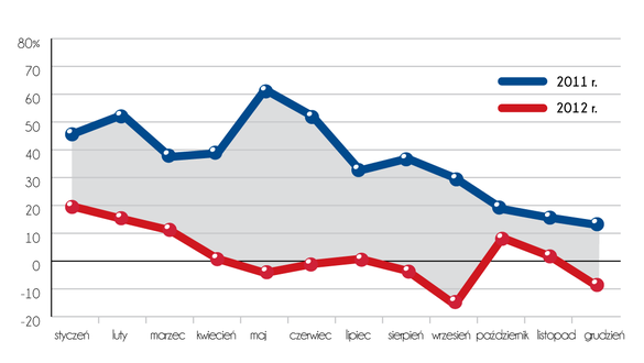 Analiza rocznej dynamiki wzrostu* liczby ofert pracy w podziale na poszczególne miesiące pokazuje, że sytuacja na rynku pracy w 2012 roku była relatywnie gorsza niż w 2011. Krzywa całego 2011 roku znajduje się po dodatniej stronie – co oznacza, że każdy miesiąc tego roku był pod względem liczby ogłoszeń lepszy niż analogiczny okres w roku poprzedzającym, czyli w 2010. Amplituda wzrostu waha się od 13% do nawet 60%.